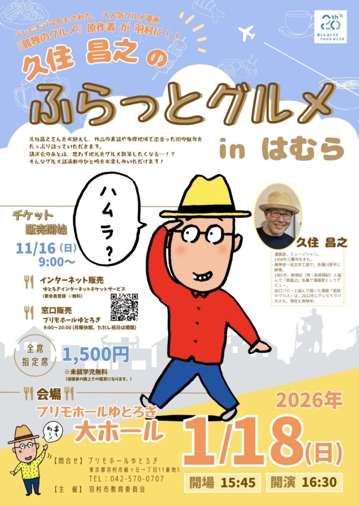 2026年1月7日 / 最終更新日時 : 2026年1月7日 まり 宇賀 講演 講演「久住昌之のふらっとグルメ in はむら」2026.1.18/東京都羽村市 東京都羽村市で開催のゆとろぎ開館20周年特別記念事業「久住昌之のふらっとグルメ in はむら」に登壇します。詳細は羽村市ウェブサイトをご覧ください。 日 時 2026年1月18日(日曜日) 午後4時30分から(開場:午後3時45分から) 場 所 プリモホールゆとろぎ 大ホール 定 員 854名(全席指定席) 入場料 一般:1,500円 *未就学児は入場無料(保護者の膝上での鑑賞になります)。 チケット 11月16日(日曜日)午前9時から販売開始 詳細・お問い合わせ 羽村市ウェブサイト