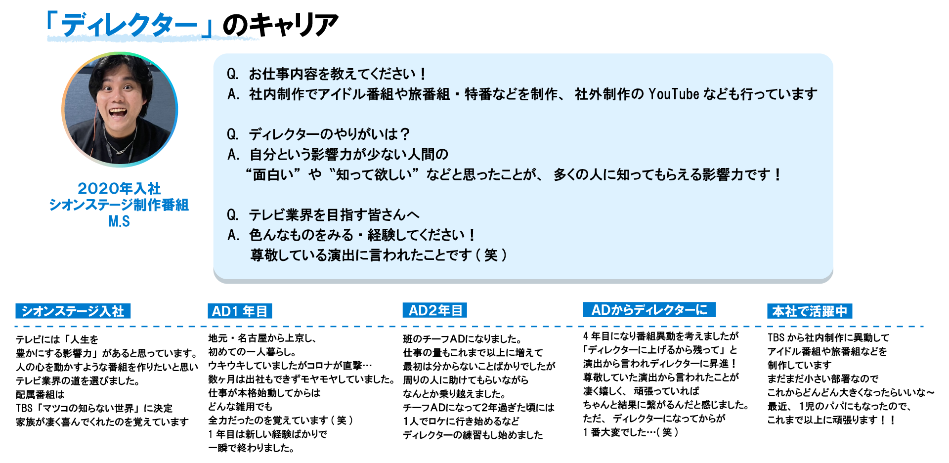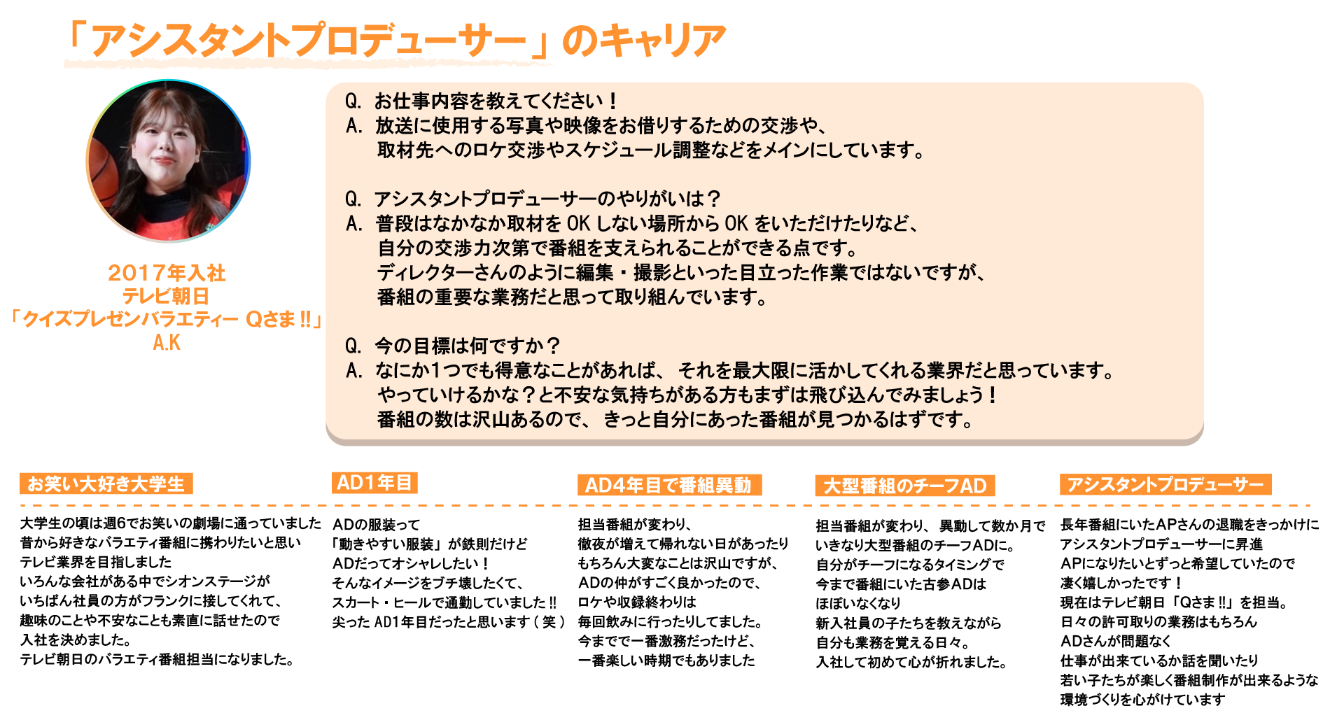 4〜5 年経験するとチーフAD の役職がつき、番組の中心となり番組進行を担う
