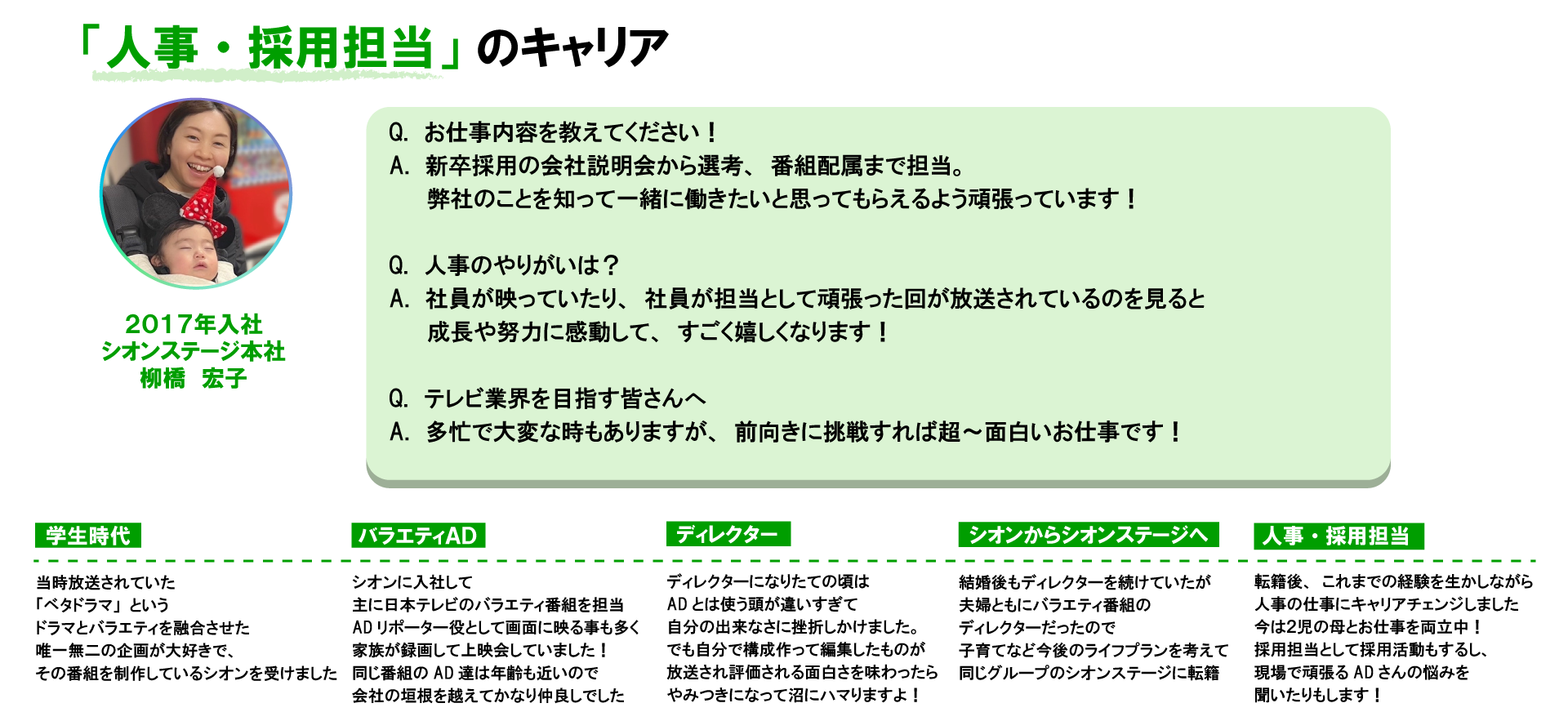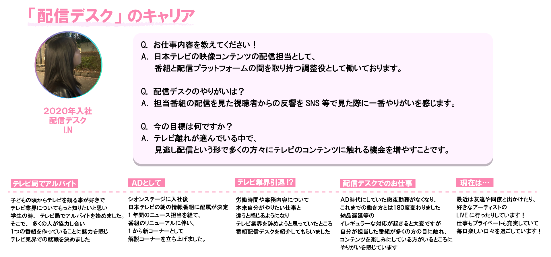 制作の現場はどうしても不規則な勤務もありますが、VOD などの配信デスクやイベント事業などの事務職へのキャリアチェンジも可能。